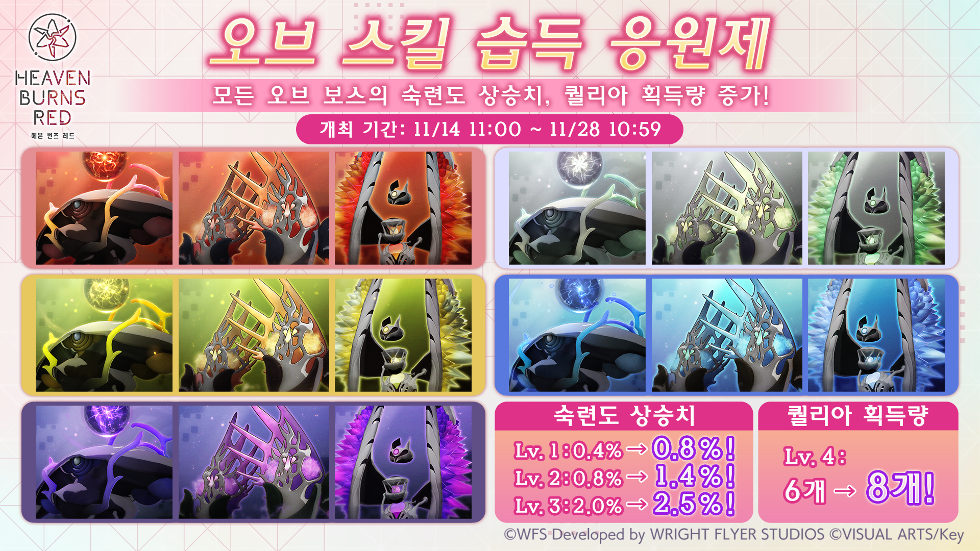 기간 중 모든 오브 스킬의 숙련도 상승치와 퀄리아 획득량이 증가합니다!